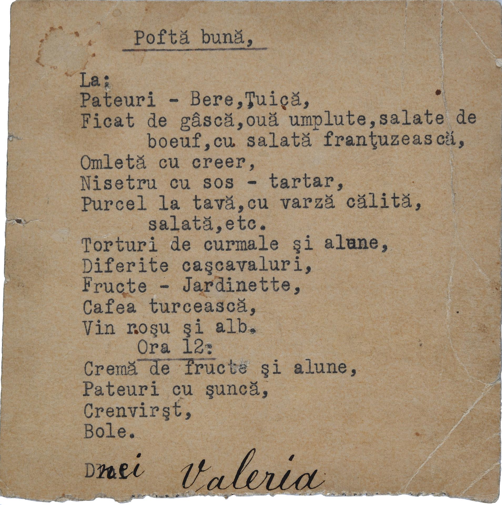 My grandmother was full of a youthful happiness – she was about to become three times twenty five, as her son Valeriu told her as a compliment, and she found this idea extremely funny and appropriate – and she told her daughter she intended her anniversary to take place in three steps: for the family, for the friends and for the neighbors in the house. The three parties have been imagined up to details by Valeria and my mother could do nothing else but comply with these wishes, as she did during childhood, becoming once again docile and lacking initiative. For the family supper, which also included some distant relatives, godchildren, all of them sincerely affectionate to Mama Mi, she chose a menu that took into account almost everybody’s preferences, as if she was offering each of the guests a present, as if she was thanking them for being around.